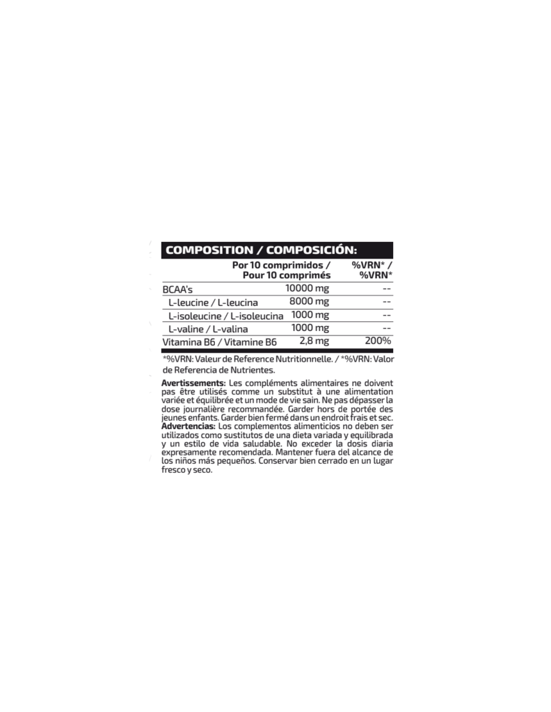 Ingrédients : BCAA 8.1.1 (L-leucine, L-valine et L-isoleucine), agent de charge (cellulose microcristalline), antiagglomérants (stéarate de magnésium et dioxyde de silicium) et vitamine B6 (chlorhydrate de pyridoxine). Peut contenir des traces de gluten, d’œufs, de lait, de poisson et de soja.