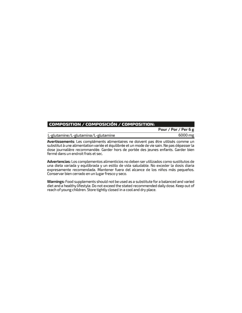 Ingrédients : L-glutamine de qualité® Kyowa, maltodextrine, acidulant (acide citrique), arôme, édulcorants (sucralose et acésulfame K) et vitamine B6 (chlorhydrate de pyridoxine). Peut contenir des traces de gluten (blé et avoine), d’œufs, de lait, de poisson et de soja.