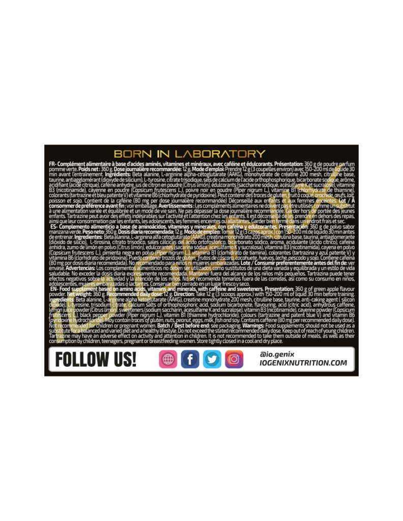 Ingrédients : Bêta-alanine, L-arginine alpha cétoglutarate (AAKG), 100% créatine monohydrate, base de citrulline, taurine, L-tyrosine, anti-agglomérant (dioxyde de silicium), citrate trisodique, phosphate tricalcique, bicarbonate de sodium, acidifiant (acide citrique), arôme, caféine anhydre, édulcorants (saccharine sodique, acésulfame K et sucralose), vitamine B3 (nicotinamide), poudre de cayenne (Capsicum frutescens L.), poudre de poivre noir(Piper nigrum L.), vitamine B1 (chlorhydrate de thiamine) et vitamine B6 (chlorhydrate de pyridoxine). Peut contenir des traces de gluten, œufs, lait, poisson et soja. Contient de la caféine (80 mg par dose quotidienne recommandée). Déconseillé aux enfants ou aux femmes enceintes.