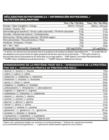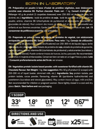Ingrédients : isolat de protéines de soja, isolat de protéines de pois, poudre de cacao, arôme, édulcorants (sucralose et glycosides de stéviol) et vitamine B6 (chlorhydrate de pididoxine). Peut contenir des traces de gluten (blé et avoine), d’œufs, de lait et de poisson.